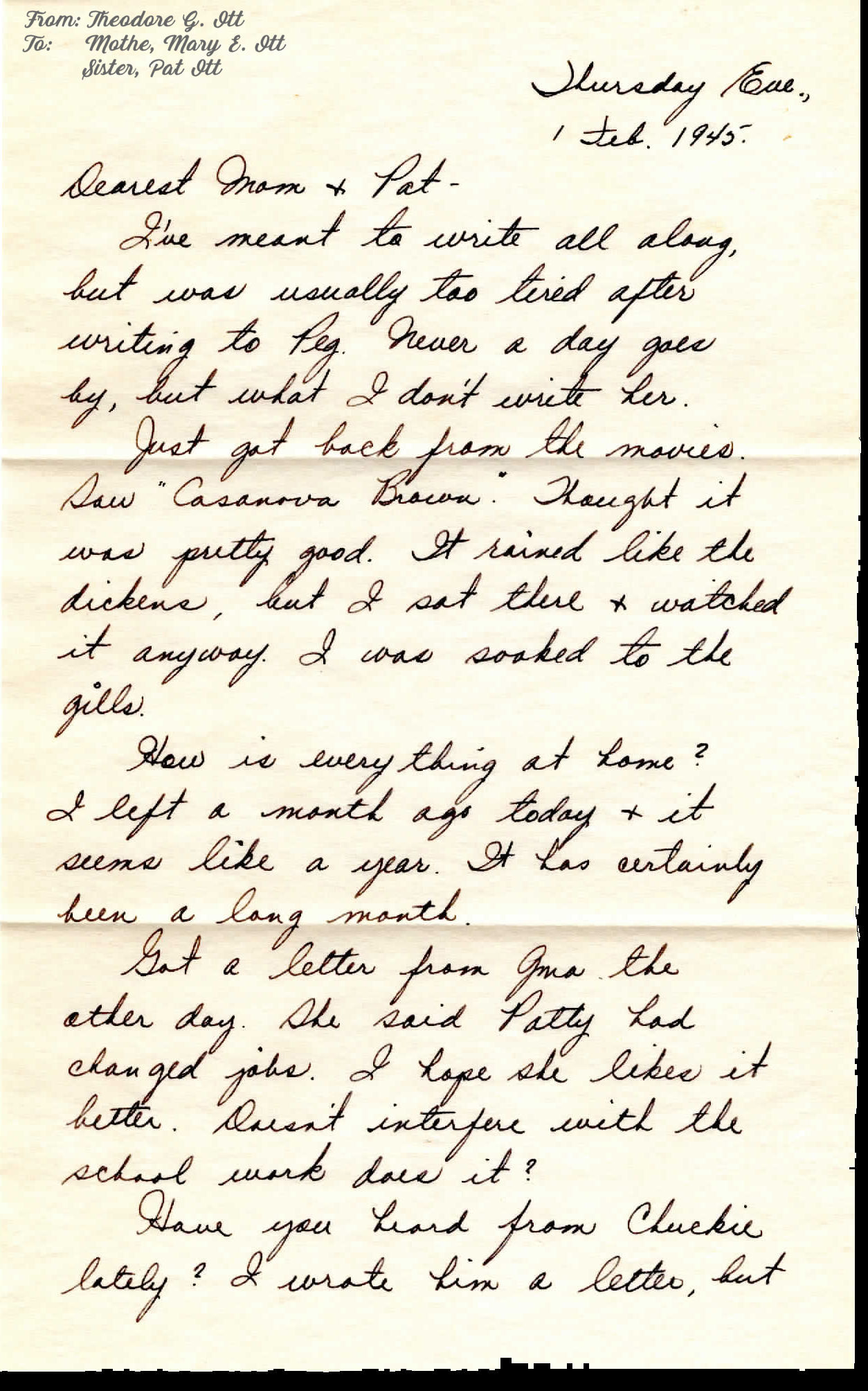 From: Theodore G. Ott To: Mother Mary E. Ott & Sister Pat Ott